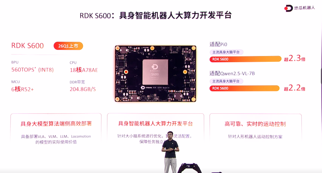 胡春旭特别介绍了最新发布的RDK S600及旭日S600处理器:“它不仅提供560TOPS算力,还内置18核CPU与6核MCU,兼顾‘大脑’决策与‘小脑’运动控制。”