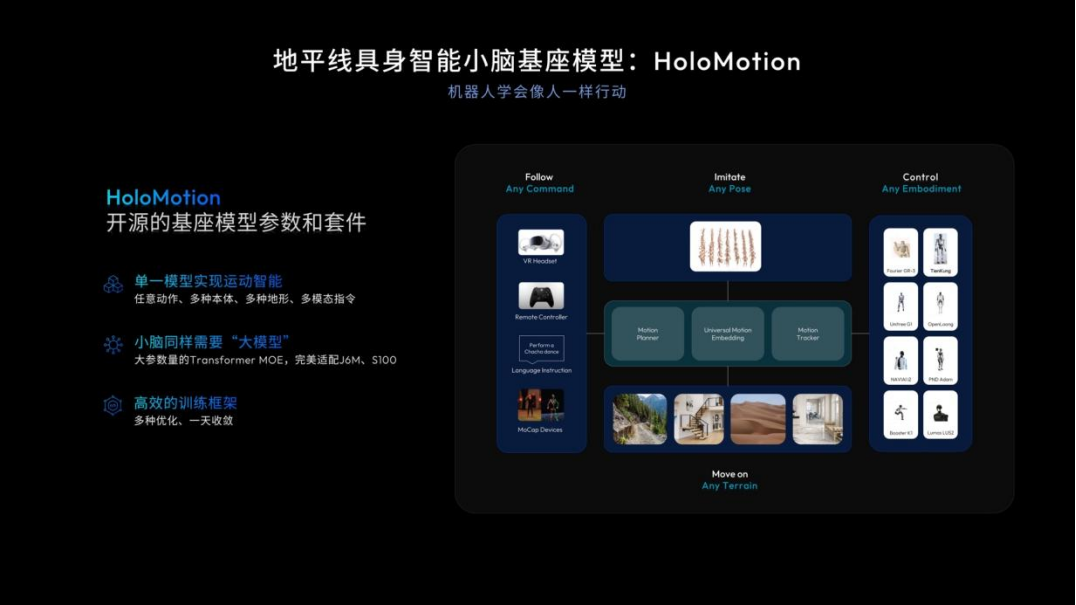 此次发布会上,地瓜又发布了开源机器人小脑基座模型HoloMotion与具身大脑基座模型HoloBrain,希望通过开源核心模型进一步降低技术门槛。
