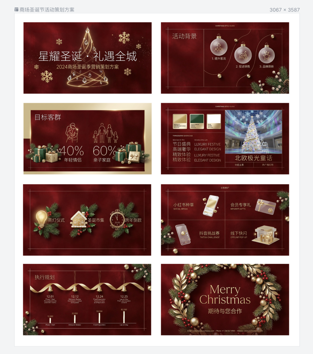 生成一份“商场圣诞节活动策划方案”中文PPT。图文并茂,极细无衬线字体,大师级排版。红色主色调,绿金辅色调。圣诞节氛围,有大量圣诞视觉元素,富有高级感和艺术感。
