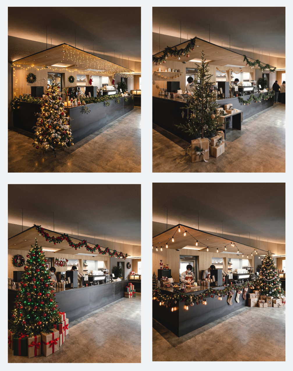 「图片」将这个咖啡馆装扮成温馨的圣诞节氛围。生成4张不同装扮的图片。