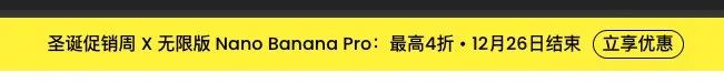 还有一个圣诞特别Offer,如果充一个Starter年包,可以解锁3天无限NanoBanana Pro。充一个Basic月包,可以解锁1天无限NanoBanana Pro。