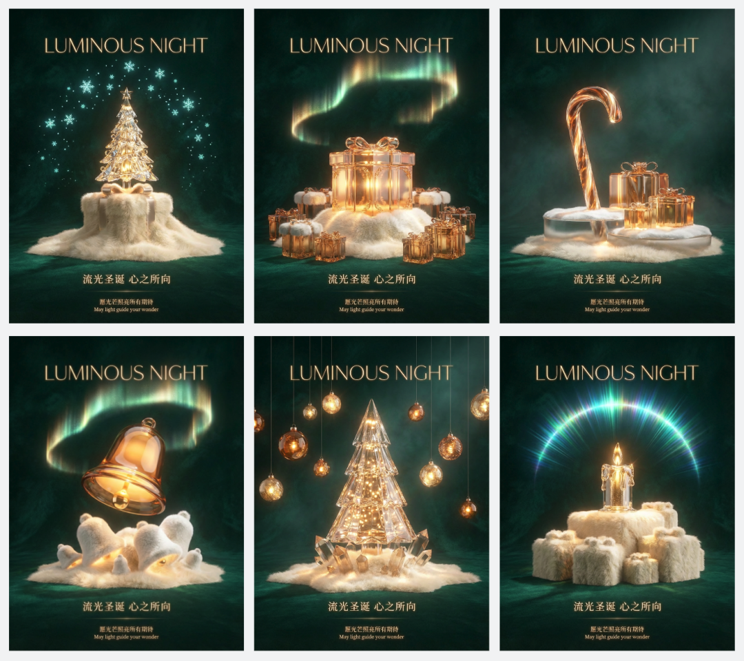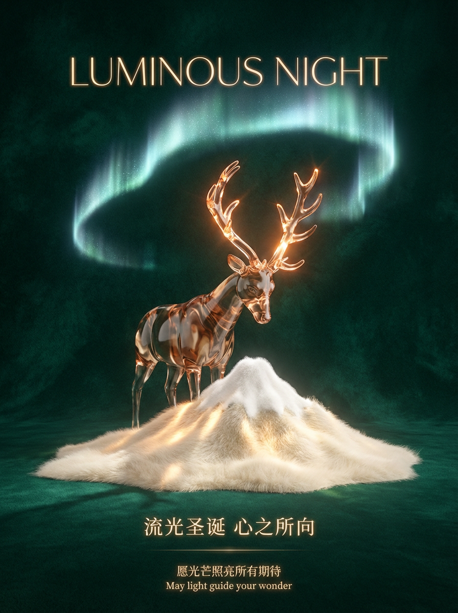 生成一张圣诞海报。画面中央,一个半透明的3D玻璃驯鹿低头凝视,其角部发出温暖的光芒,照亮下方由白色羊绒堆积而成的微型山脉。背景是深邃的宝石绿色天鹅绒,一道由光构成的“极光”从顶部弧形掠过。构图采用居中对称:顶部是纤细的发光英文字体“LUMINOUS NIGHT”,下方对应小巧的中文“流光圣诞 心之所向”。最底部放置一行小字:“愿光芒照亮所有期待”,英文为“May light guide your wonder”。色调以幽绿、透明琥珀色与乳白为主,突出玻璃的通透折射与羊绒的细腻触感,营造静谧而充满希望的节日氛围。