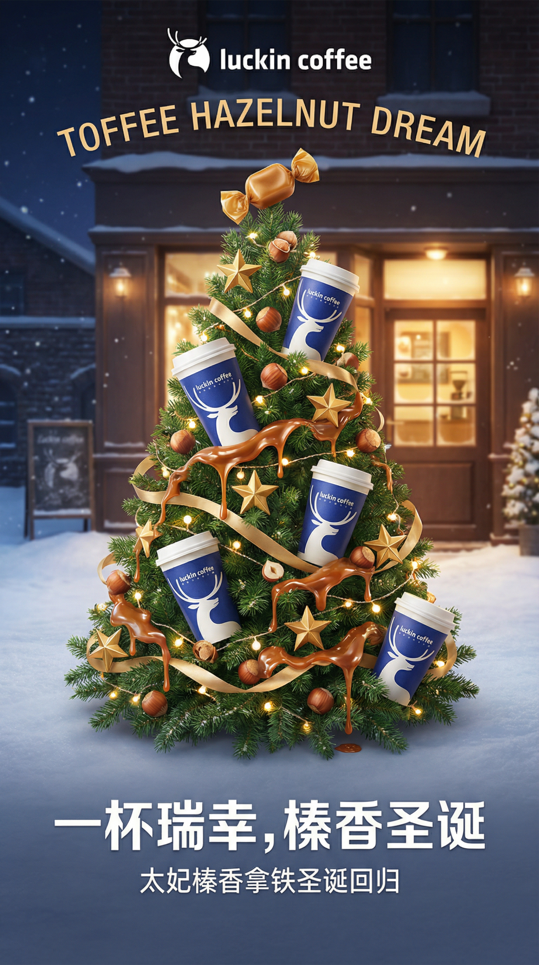 生成咖啡海报。竖版构图,圣诞主题。画面中心是一棵圣诞树,树上挂满了瑞幸经典蓝色咖啡杯,还有很多星星、飘带、串灯、榛子等装饰。“树顶”是一颗金色的太妃糖。树上流淌着液态的、带有细腻光泽的榛果酱。背景是咖啡馆门口,厚厚的积雪。文字信息简洁:上方是品牌Logo与英文“TOFFEE HAZELNUT DREAM”,下方是醒目中文标题“一杯瑞幸,榛香圣诞”以及小字“太妃榛香拿铁圣诞回归”。风格干净、高级,现代设计感。