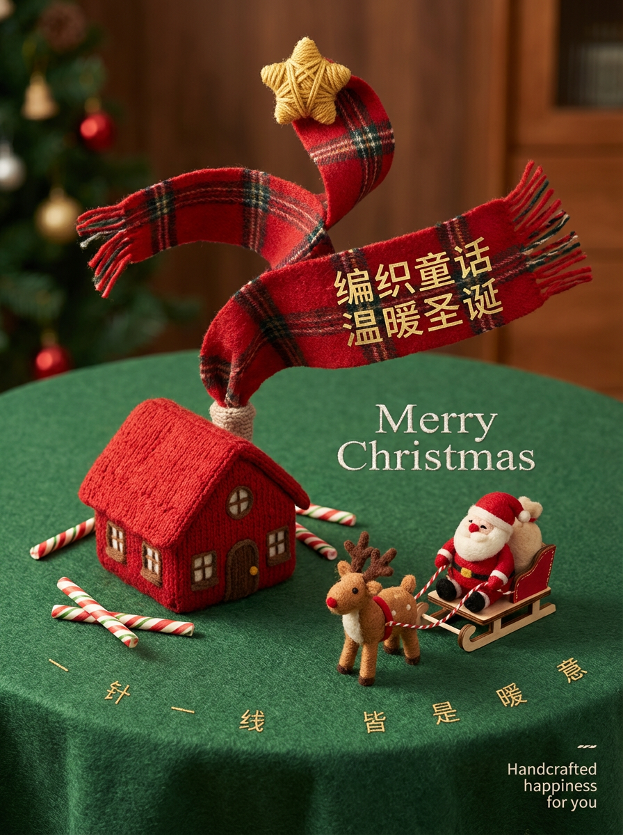 圣诞围脖海报,融合3D立体元素与羊毛毡手工质感。采用俯视视角,展现一个由森林绿羊毛毡“铺成”的桌面,上面“放置”着3D风格的红色针织小屋、糖果棒和毛毡小鹿用雪橇拉着圣诞老人。从小屋的烟囱里,“升起”一条红色格纹羊毛围巾,在空中自然弯曲成“螺旋桨形状”,顶端有一颗毛线球星星。文字设计融入场景:英文标题“Merry Christmas”以刺绣样式缝在绿色“桌面”上;中文“编织童话 温暖圣诞”以烫金样式印在展开的红色围巾上;画面边缘散落着祝福语“一针一线 皆是暖意”,英文小字“Handcrafted happiness for you”位于右下角。色调充满童趣,强调羊毛毡的可爱肌理与针织的立体感。
