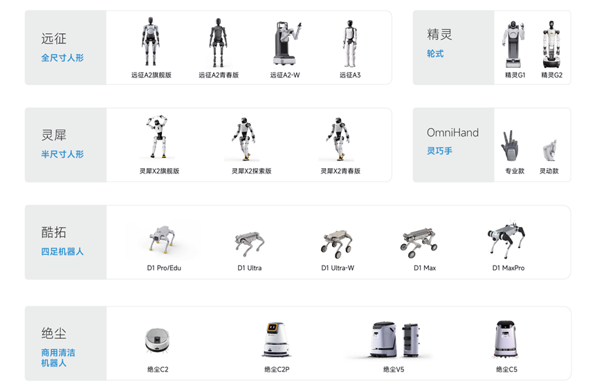 智元已经形成远征、精灵、灵犀、酷拓、绝尘等全产品组合,覆盖全尺寸人形、轮式机器人、半尺寸人形、四足机器人、商用清洁等多种形态,是业内少数能够在多个本体方向同步推进、并形成完整产品矩阵的企业。