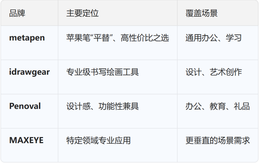 千分一的成功很大程度上源于其精准的市场定位。在Apple Pencil市场零售价近千元的高端市场之外,千分一敏锐地捕捉到了消费者对高性价比产品平替需求的巨大市场空间。公司打造了 idrawgear、metapen、Penoval及MAXEYE 四大智能笔品牌。这些品牌并非简单重复,而是有着差异化的市场定位:主攻亚马逊平台的 metapen 已成为平台畅销品牌,获得“TopBrand”认证,主打高性价比的Apple Pencil“平替”;idrawgear 等品牌则覆盖更广泛的设计与办公场景。