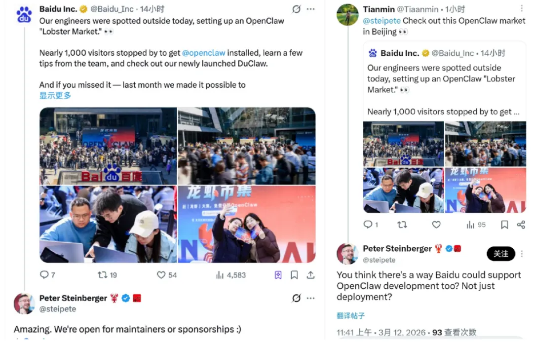 值得一提的是,百度12日上午推出“红手指Operator”App,当天中午就被OpenClaw创始人Peter Steinberger关注到,他毫不掩饰的给百度点赞,并连续评论称中国AI创新速度“Amazing”,表示愿与百度共同开发“龙虾”。