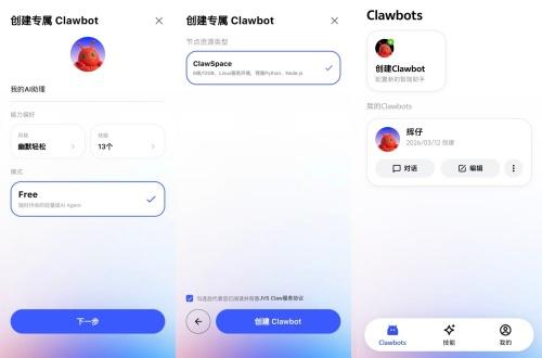 你无需掌握任何代码知识,手机简单三步即可创建专属AI智能体龙虾,全程无需配置节点、大模型API密钥,也不用绑定微信、飞书等IM工具,普通人3分钟就能实现“养虾自由”。换言之,JVS Claw大幅降低龙虾安装门槛,真正做到一键安装、零门槛上手。的确如此,我毫不费力地创建自己的专属Clawbot“辉仔”。