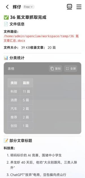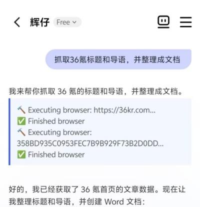 作为一名科技自媒体,我非常渴望能高效获取一手科技资讯,尝试让“辉仔”抓取36氪文章标题和导语,并整理成文档。很快,“辉仔”便在对话框中展示抓取结果,文章分类和统计一目了然,还贴心地创建文档方便阅览。