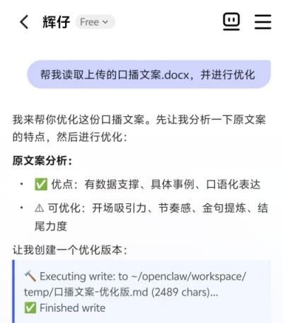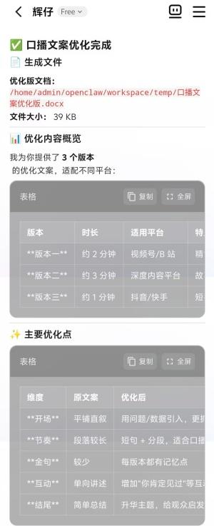 录制口播视频是我的日常工作之一,准备一份有趣有料的口播文案显得尤为重要。我吩咐“辉仔”:帮我读取上传的口播文案.docx,并进行优化。“辉仔”很给力,马上端出优化方案:提供三个版本适配不同平台、突出主要优化点和优化技巧说明,非常实用,这个好帮手让我省心不少。