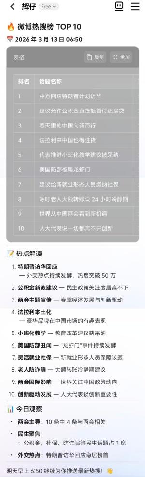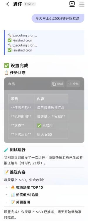 “你定规则,AI当全自动流水线长”,用这句话来形容AI流程调度再适合不过。在整个流程中,你只负责做决策、看结果,其他的都交给AI。比如,为了快速了解国内外大事,我给“辉仔”安排一个任务:每天早上6点50分帮我汇总最火的10条微博。今天6点50分一到,它果然准时推送最新的微博热搜榜。