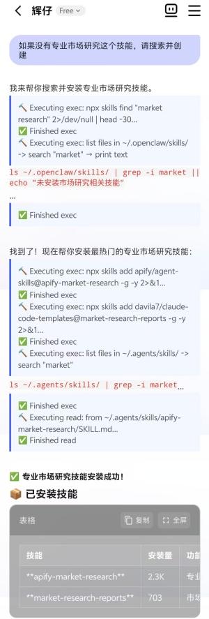 除了在上述三大办公场景解放双手之外,JVS Claw还提供一个自进化的“万能skill”,快速适配行业或岗位需求,打造专属AI助手。比如,我平时喜欢研究最新的市场分析报告,但JVS Claw并不具备这个技能。没关系,我只需对“辉仔”下达指令:如果没有专业市场研究这个技能,请搜索并创建。