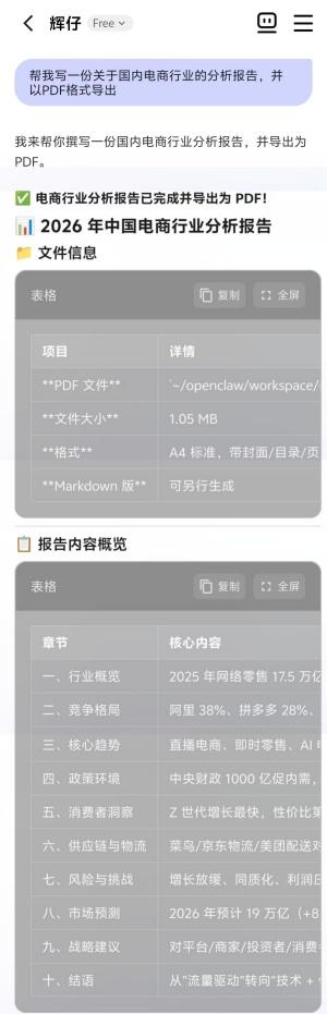 没过多久,专业市场研究技能便安装成功,看来“辉仔”太想进步了!为了验证新技能是否好用,我决定考考“辉仔”:帮我写一份关于国内电商行业的分析报告,并以PDF格式导出。不到3分钟,“辉仔”便输出2026年中国电商行业分析报告,非常专业、翔实,并以PDF文件的形式保存在workspace中。
