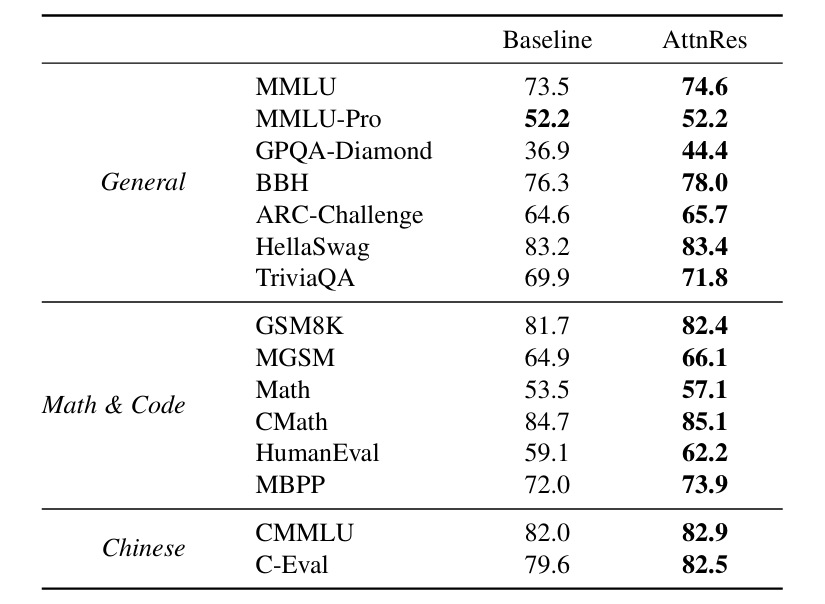 GPQA-Diamond提升7.5%,Math提升3.6%,HumanEval提升3.1%。这一结果在逻辑上高度自洽:数学推导与代码生成皆要求模型具备长时间推理与信息保持能力,AttnRes的深度检索机制恰好契合了这种“不忘初衷”的内在需求。