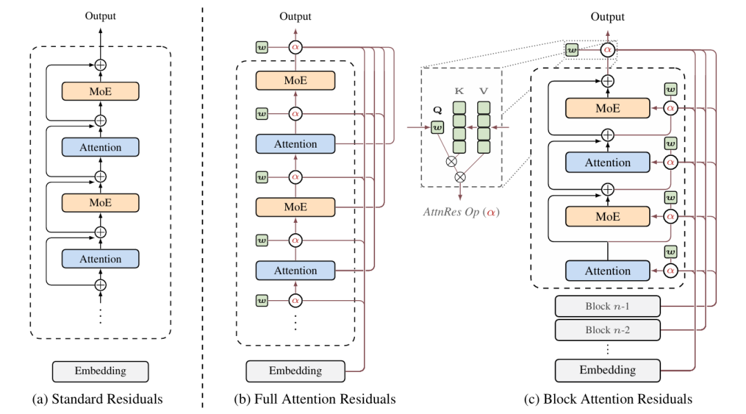 这套内容感知、输入依赖的选择机制,本质上是将Transformer的核心理念横向迁移至残差路径的设计中。残差连接由此从被动的“信息搬运”,转变为主动的“按需检索”,有效规避了深层信息稀释的痼疾。