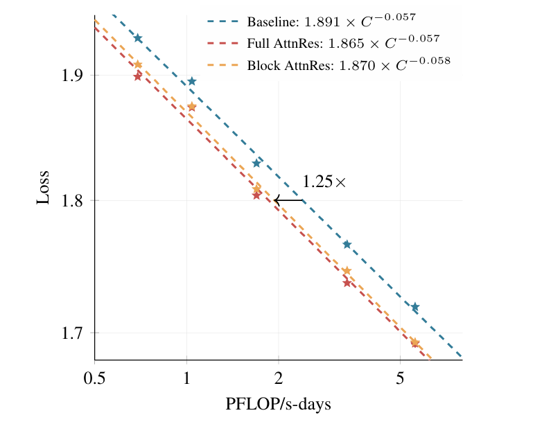 规模化法则曲线显示:在同等算力投入下,应用Block AttnRes的模型始终获得更低的损失值。简单换算,该架构使模型能达到传统基线模型需耗费1.25倍算力方可实现的性能。对于耗资动辄千万美元级的预训练阶段而言,“白嫖”25%的算力增益,蕴含着巨大的商业价值。
