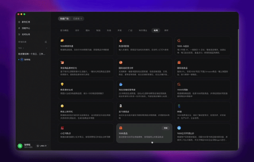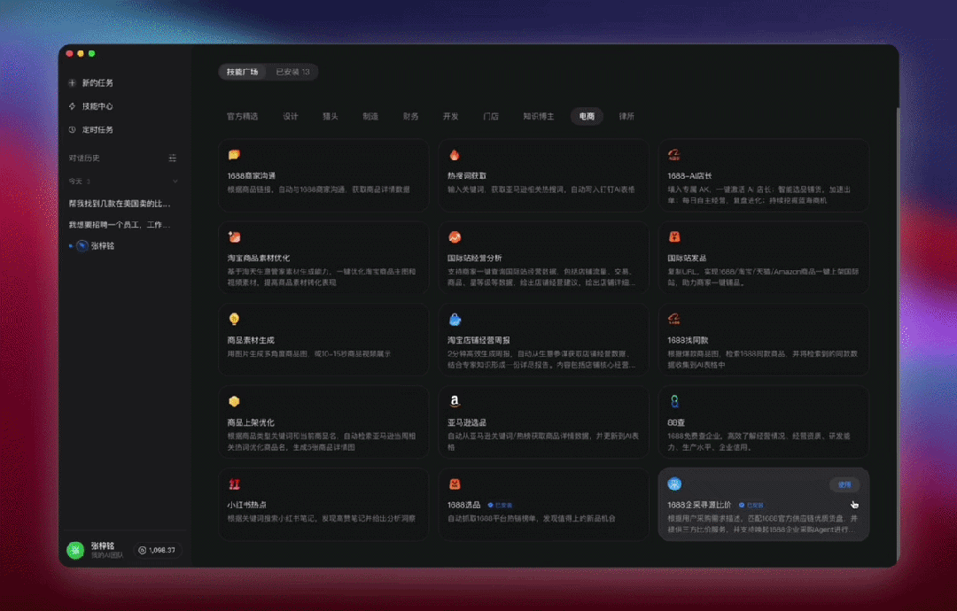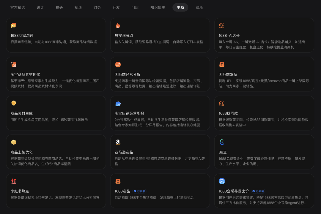 作为阿里的看家本领,悟空的电商类技能是最多的,几乎覆盖了电商和跨境电商全流程。