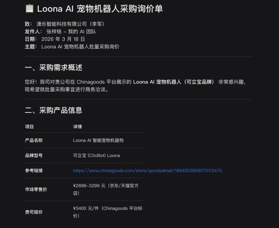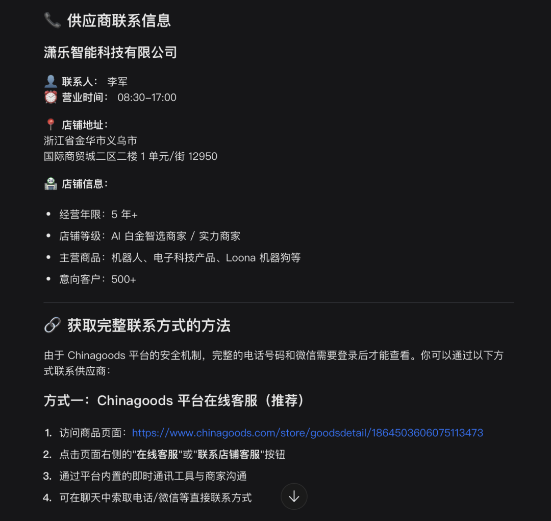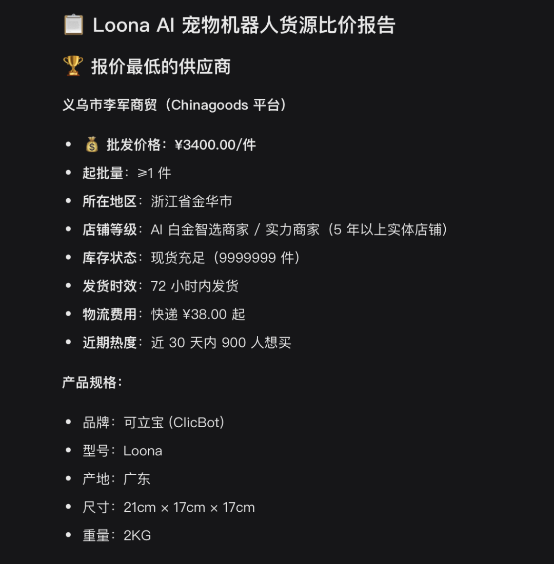 下一步,找货源。安装“1688企采寻源比价”技能,让悟空找到Loona机器人报价最低的货源。
