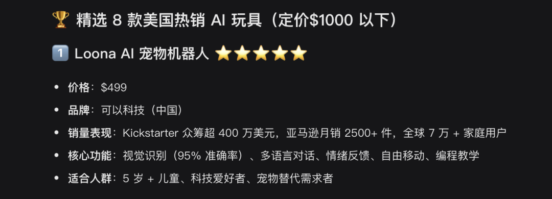 最后它推荐了这款Loona AI 宠物机器人,最符合我的需求,也最适合我进行销售。