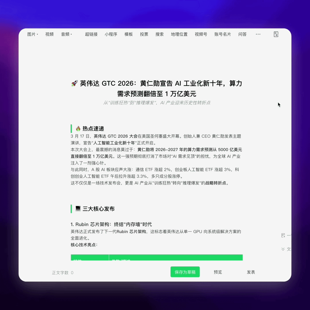 找选题虽说简单,但很多AI却找得不好,要么老生常谈,要么并不热门。而悟空找得很好,英伟达大会、Kimi、315,都是这两天讨论度最高的话题。