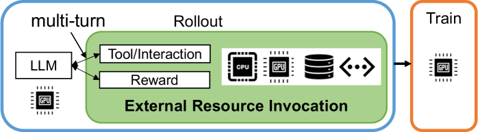 因此,智能体强化学习的训练过程,高度依赖于大语言模型训练集群之外的异构外部资源。