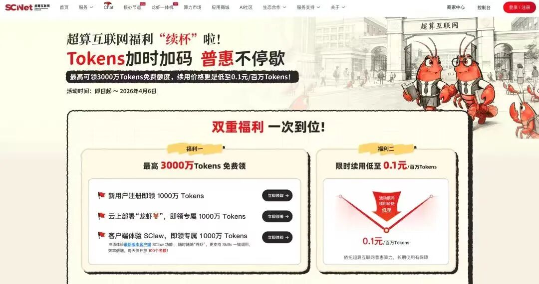为推动科研算力普惠,超算互联网近期持续加码Tokens福利。新用户注册登录超算互联网就可领取1000万词元;一键部署OpenClaw可再领1000万专属词元;参与超算互联网客户端SClaw测试体验,还可额外获赠1000万词元。此外,超算互联网用户享0.1元/百万Tokens的特惠续用价,将延至4月6日。