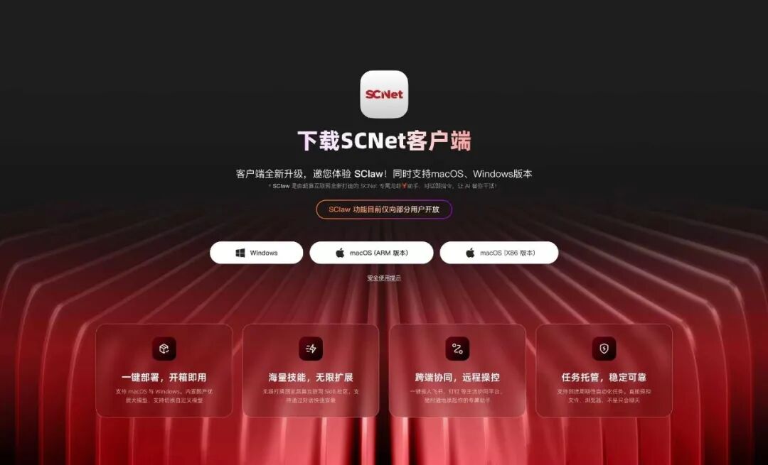 从刚刚上线的科研专属龙虾SClaw来看,其并非普通AI工具,依托超算互联网AI社区Skills栏目,它可接入海量科学计算Skills,并覆盖全科研场景需求。此外,SClaw实现真正意义上的开箱即用,用户仅需将SCNet客户端升级至最新版本,点击左上角图标即可一键部署登录,无需额外安装软件、配置环境,就可实现查文献、实验提醒等科研任务,并支持7×24小时全天候值班,以此助力科研工作减负增效、加速突破。