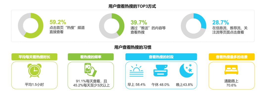 唯有热搜是个例外。艾瑞咨询最近发布的《互联网平台热搜价值研究报告》显示,当下用户获取热点信息的第一大途径仍然是热搜榜单,77.6%的用户通过热搜获取实时热点,远超信息流及推荐的 41.1%。