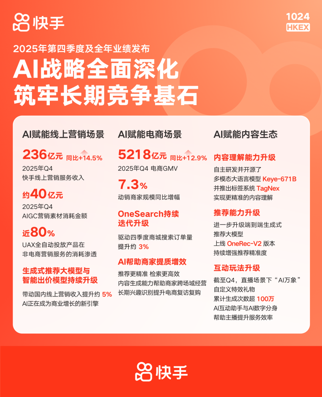 财报期内,快手端到端生成式检索架构OneSearch驱动商城搜索订单量提升约3%;推荐、检索、内容生成、长期兴趣理解与订单AI诊断等能力持续落地。
