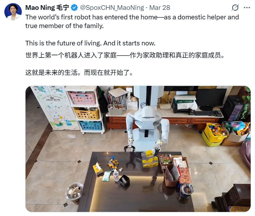 人民日报、央视等主流媒体相继关注,外交部发言人毛宁也在外网转发了优理奇机器人做家务的视频,配文称机器人正在走进家庭,未来已然开启。