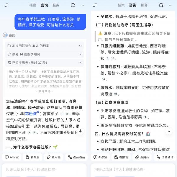 AI查询了14篇医学论文后,不仅给出了可能的过敏源头,还有预防发作、缓解症状的建议,以及必要时的用药选择。