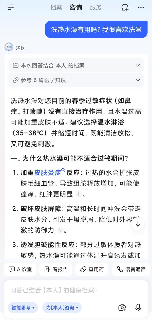 讯飞晓医给出的种种建议,让潘哥有了对抗过敏的兵法,不过潘哥此前过敏时发现,只要洗个热水澡,身体就会变舒服。