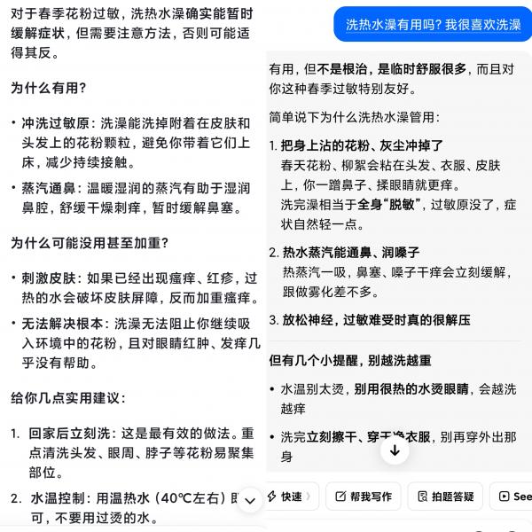 过程中,潘哥向一众AI询问:“我喜欢洗热水澡,这对春季花粉过敏,有没有治疗作用?”