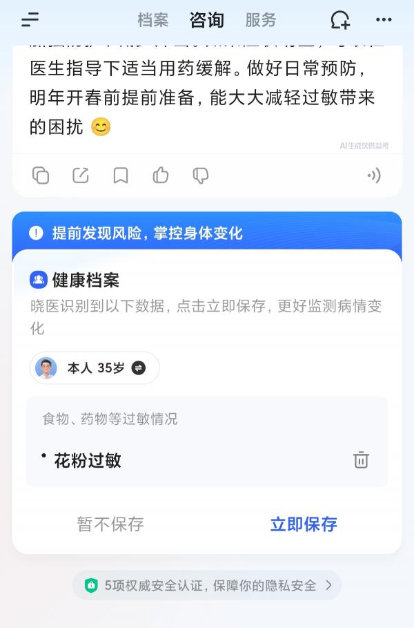 比如,潘哥与讯飞晓医对话时,它会询问是否将信息记录建档?这种个人医疗全景图,不仅用170个细分标签,构建了个人健康画像;还能在用户后续咨询时,给出个性化的建议。