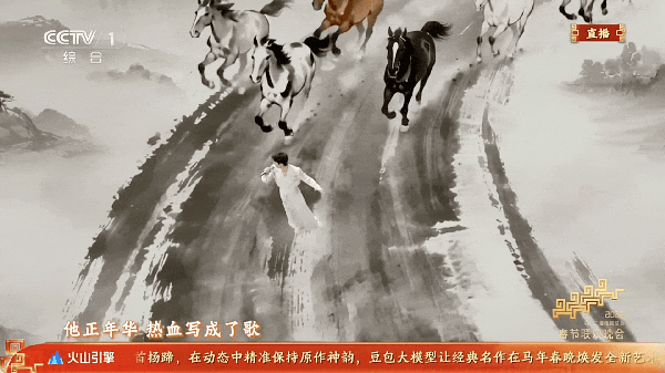 在最近火爆全球的视频生成模型Seedance 2.0赋能下,徐悲鸿的《六骏图》被数字化,更被赋予了生命力。动态水墨完美还原了骏马昂首扬蹄的神韵与奔腾气势,搭配流动的山河水墨长卷,营造出人在画中游的沉浸感,精准戳中了马年生肖主题。