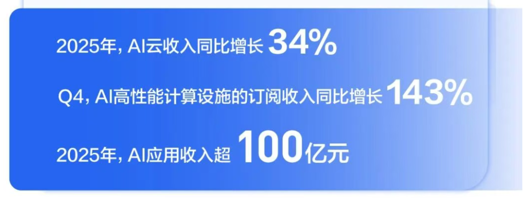 百度AI云全年收入同比增长34%,其中AI高性能计算设施收入的订阅收入同比增长143%,增速较三季度的128%进一步上扬。