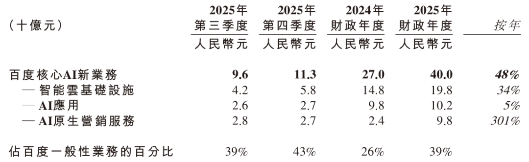 在这份财报中,百度的AI业务无疑是最受瞩目的增长新引擎。2025年全年该板块收入达到400亿元;仅第四季度,百度AI业务收入在一般性业务收入中的占比跃升至43%,远超市场预期。