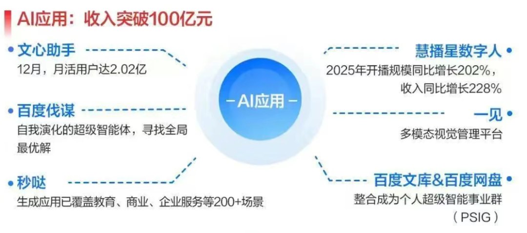 从业务细分数据中,我们得以洞见百度AI在各大板块中的全面开花。2025年第四季度百度的AI应用收入为27亿元,全年累计收入突破100亿元大关,标志着着百度在AI应用侧已具备持续造血能力。