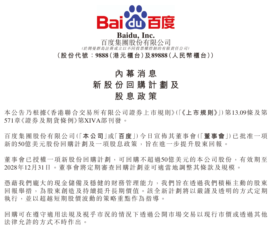 百度在经营现金流转正、AI业务进入变现通道的关键节点施行股份回购与股息分配,标志着该公司从“成长投入期”正式步入“盈利兑现期”,同时向资本市场宣告其已具备持续回馈股东、长期价值创造的底气与能力。