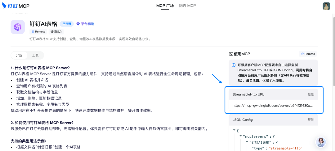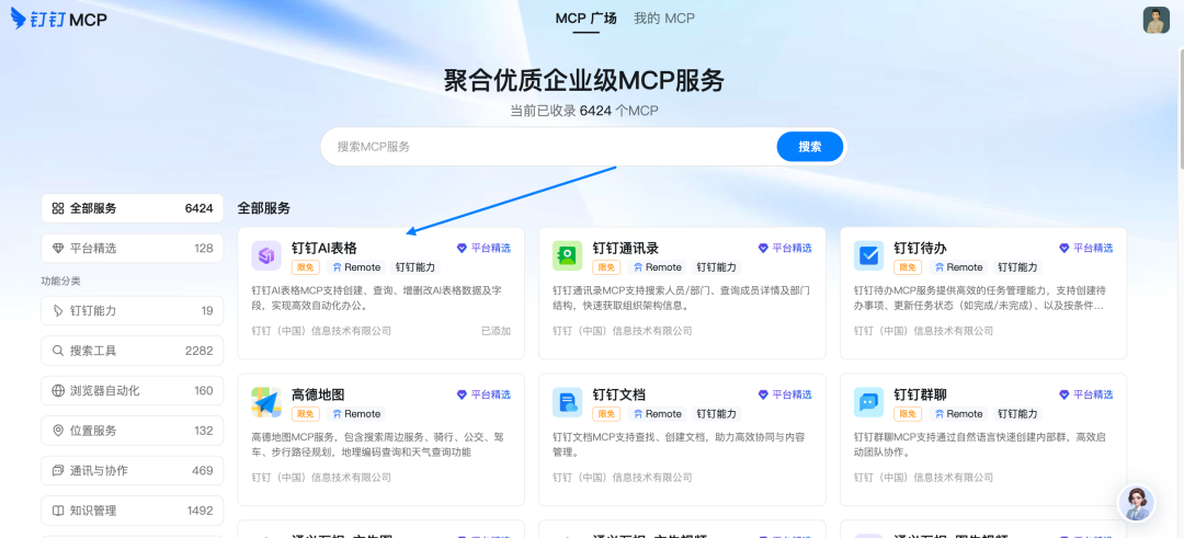 访问钉钉的MCP广场:mcp.dingtalk.com,点击「钉钉AI表格」。