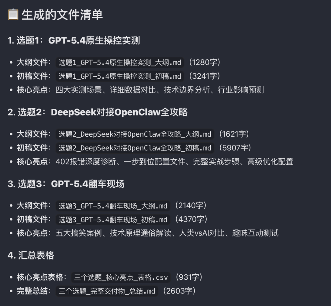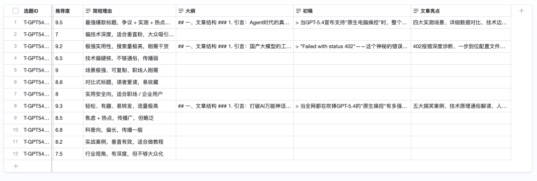 不是硬夸,它设计的字段真的实用。写作难度、推荐度和简短理由,都是选题决策的重要参考。推荐度大于9.0的选题,继续生成大纲、初稿和核心亮点。它给了我一堆交付文件。