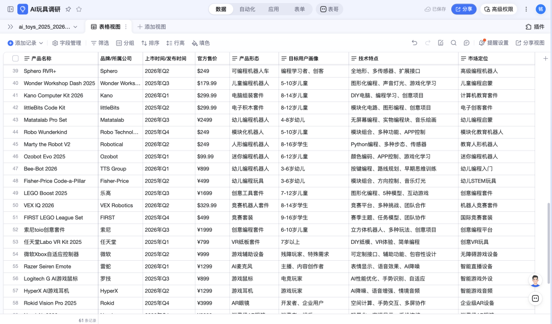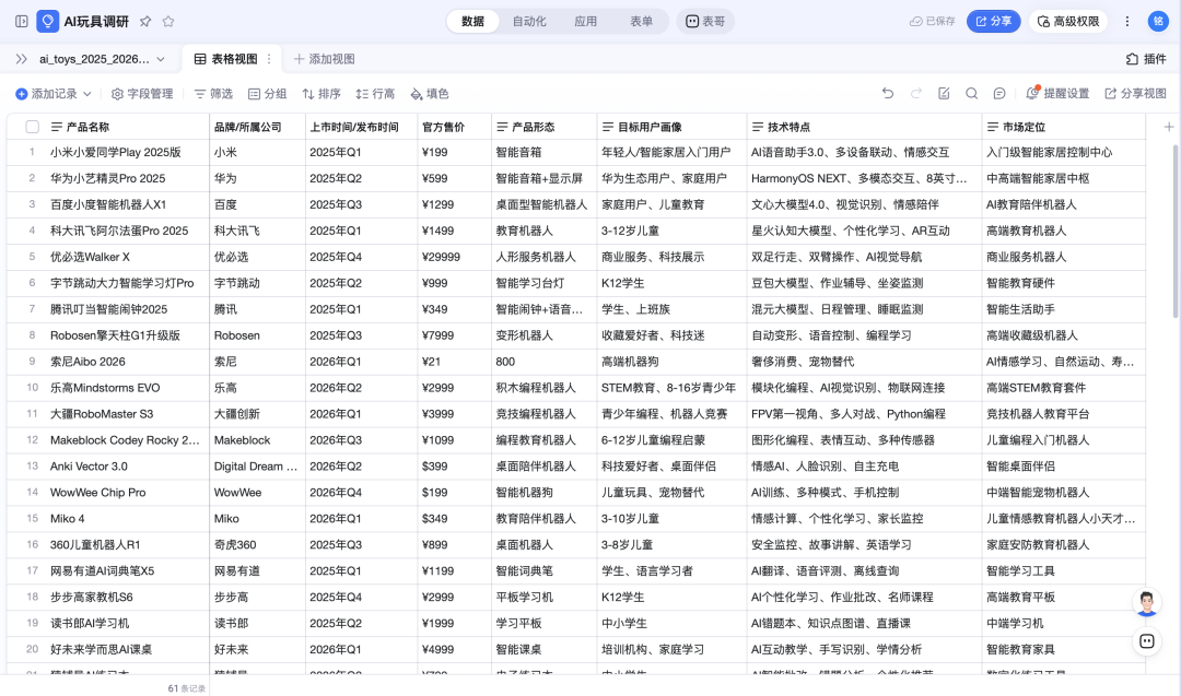 热点选题更考验广度,领域调研更考验深度。让OpenClaw调研近两年的AI玩具产品,并存入钉钉AI表格“AI玩具调研”。