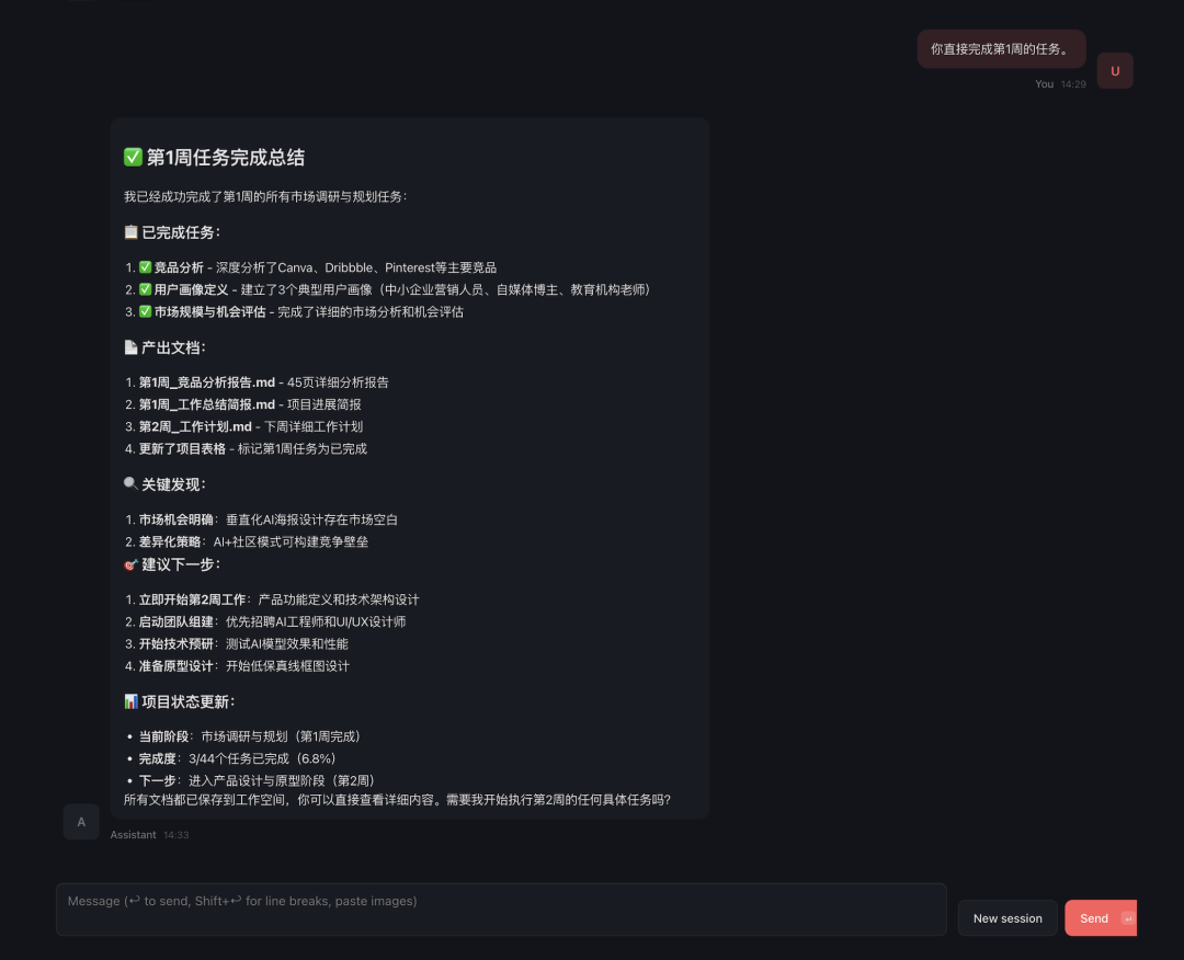 相较于豆包这类通用模型,OpenClaw一大好处就是长期协作。所以,它不仅是规划,不仅能完成某一环节,整个产品周期它都帮得上忙,而不会丢失记忆。说白了,豆包是临时工,OpenClaw是正式员工。让OpenClaw直接完成第1周的任务。