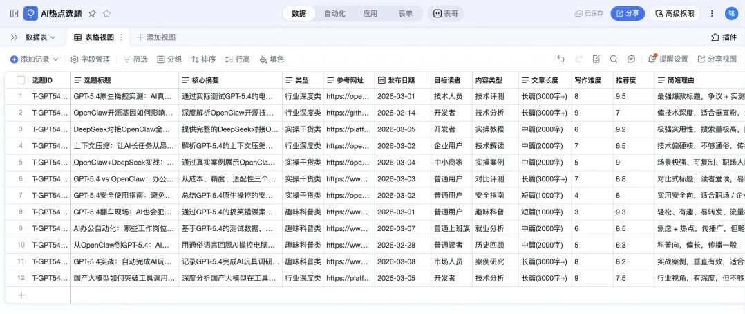 告诉OpenClaw我要做AI领域公众号选题,获取最近两周的AI热点,设计详细专业的字段,将热点信息存入钉钉AI表格“AI热点选题”。