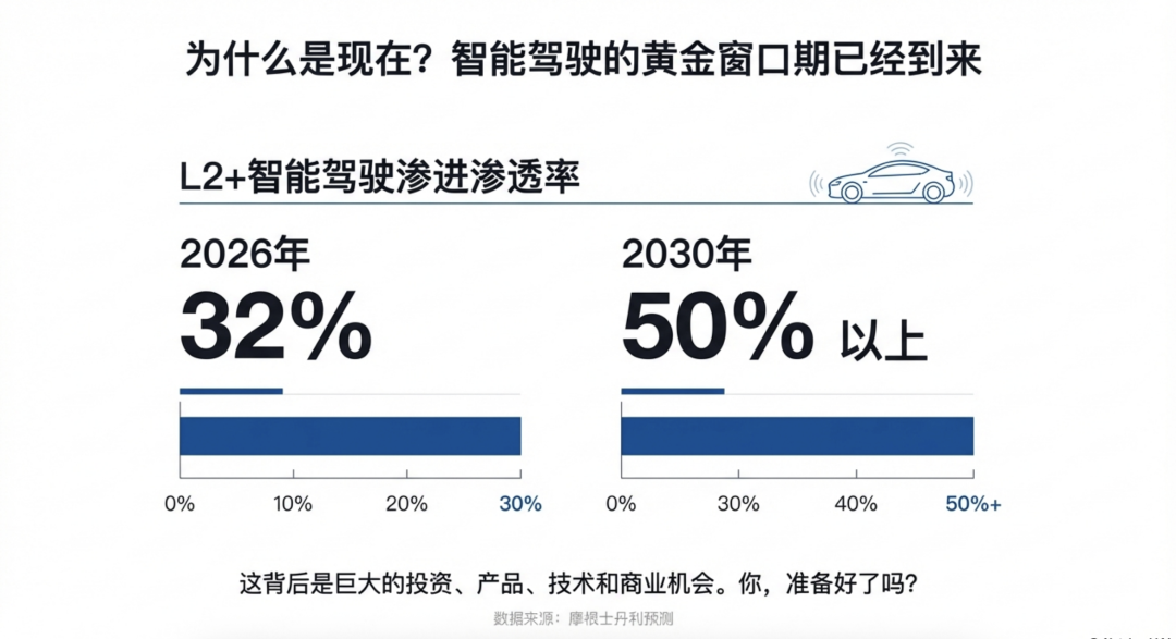 首先回答自动驾驶产品,肯定还有未来而且是汽车行业最具有未来的产品。这个可以看我们之前文章《摩根士丹利给2026中国车市的预言:当“增长惯性”失效,我们该如何穿越周期?》中有写到:智能驾驶:预计到2026年,L2+智能驾驶渗透率将达到32%,到2030年达到50%以上。所以这里面有巨大的投资、产品、技术、商业机会。