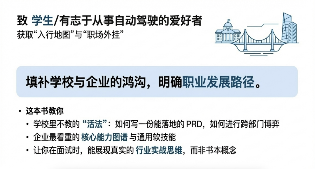 学校里教的是代码和原理,而这里教的是‘活法’——如何写一份能落地的需求文档(PRD),如何进行跨部门的需求博弈,以及如何培养企业最看重的通用软技能。它为你拆解了自动驾驶产品经理的核心能力图谱,帮你打破信息差。读完它,你在面试官面前聊的将不再是书本概念,而是真实的行业实战思维。”