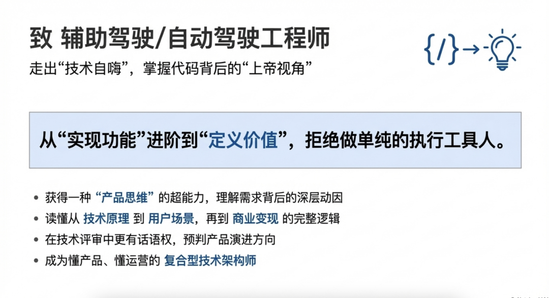 如果你是【辅助驾驶/自动驾驶工程师】:走出“技术自嗨”,掌握代码或者零件背后的“上帝视角”推荐语核心:从“实现功能”进阶到“定义价值”,拒绝做单纯的执行工具人。