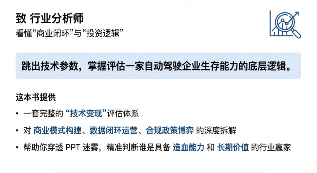 “在自动驾驶的下半场,单纯的技术领先已不再是唯一的护城河。对于分析师而言,这本书的价值在于它提供了一套完整的‘技术变现’评估体系。