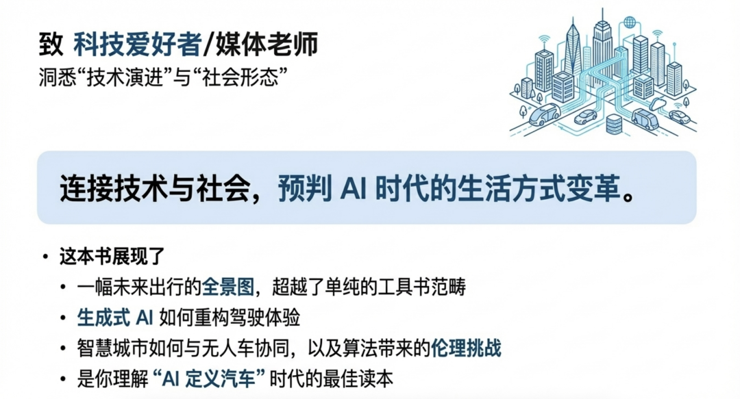 媒体人可以从中读懂生成式 AI 如何重构驾驶体验,智慧城市如何与无人车协同,以及我们该如何面对算法带来的伦理挑战。如果你想写出有深度、有前瞻性的科技报道,这本书提供了从微观技术细节到宏观社会影响的详实素材,是你理解‘AI 定义汽车’时代的最佳读本。”