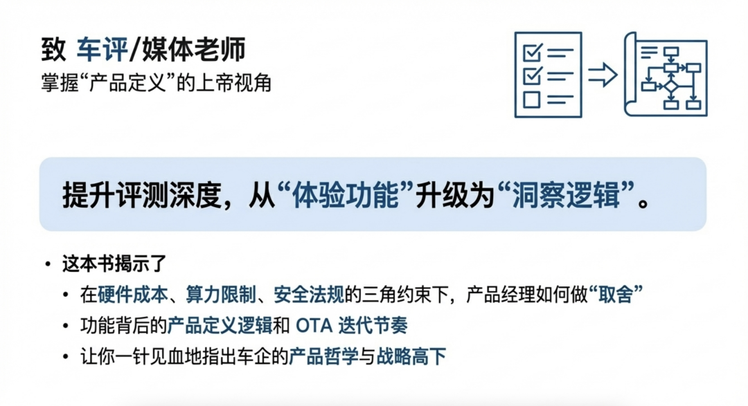 这是一本关于‘取舍’的书。它揭示了在硬件成本、算力限制和安全法规的三角约束下,产品经理是如何定义功能的。作为车评/媒体老师,这本书能为你提供视角的降维打击——当你理解了背后的产品定义逻辑和 OTA 迭代节奏,你的评测将不再只是复述参数,而是能一针见血地指出车企的产品哲学与战略高下。”